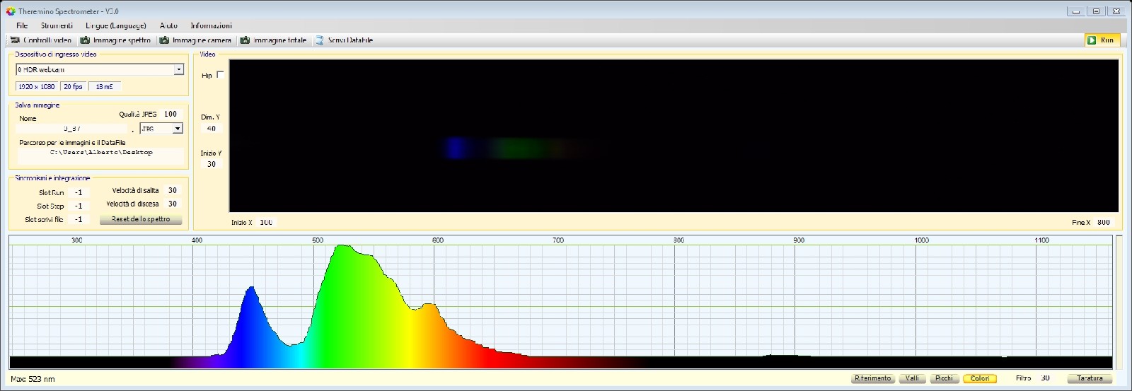 Theremino. Questo SW è portable: basta scompattarlo ed eseguirlo. Il primo spettro che si vede è quello relativo ad una lampada